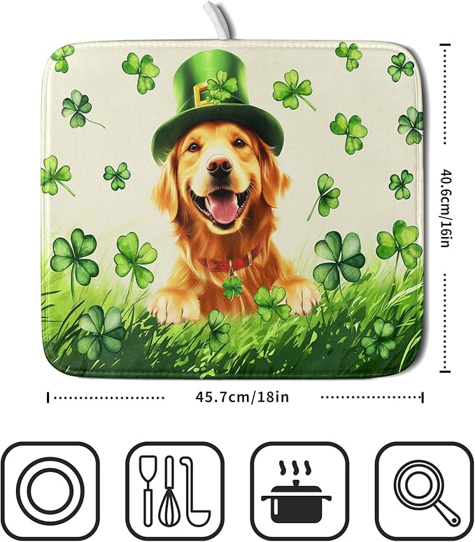 St Patrick's Day Dog Dish Drying Mat 16x18 inch Green Shamrock Dishes Pad Absorbent Microfiber Dish Drainer Mat for Kitchen Counter Coffee