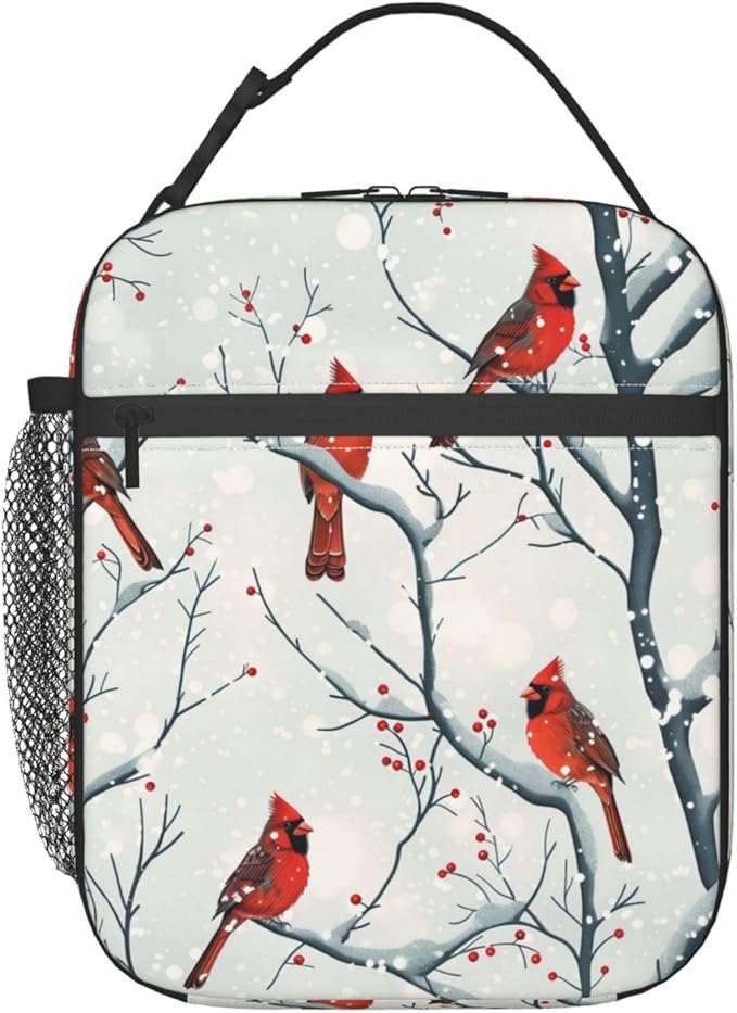 Reusable Cardinal Lunch Box for Kids Girls Boys Women Adult, Insulated Bird Winter Snowy Lunch Bag,Polyester Cooler Handbags Case for School Picnic Work Travel Beach or Hiking