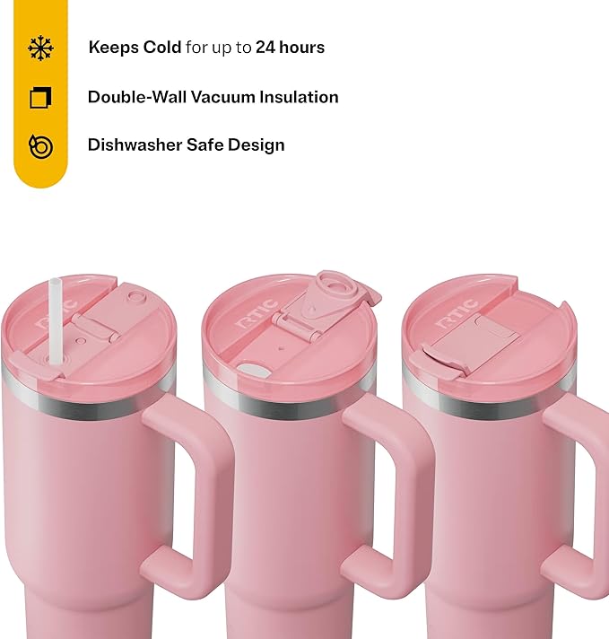 RTIC 40 oz Road Trip Tumbler Double-Walled Cermaic Lined Insulated Stainless Steel Portable Travel Coffee Mug Cup with Lid, Handle and Straw, Dusty Rose