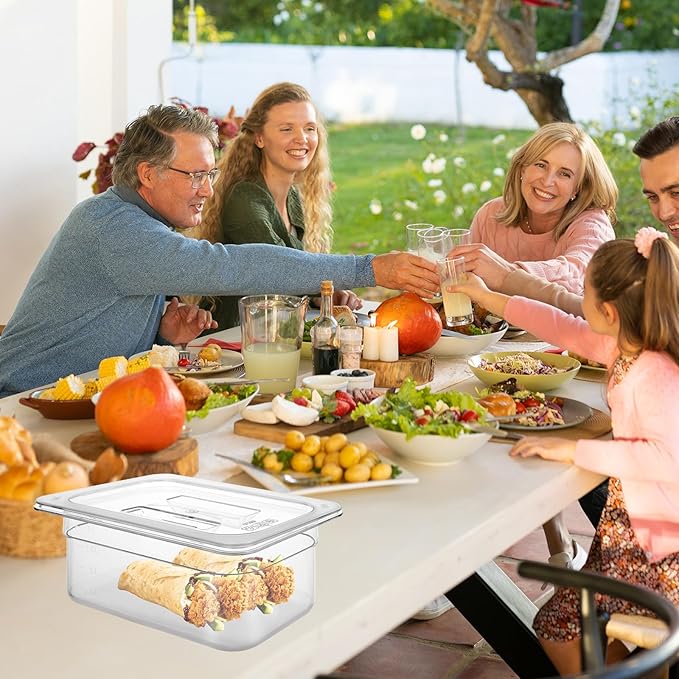 - SCALE INDICATOR: The transparent design of the plastic clear food container makes it easier for you to observe the food stored inside clearly. With the capacity indicator in liters on the surface, you can easy to estimate when using the deep polycarbonate food pan to avoid wasting food