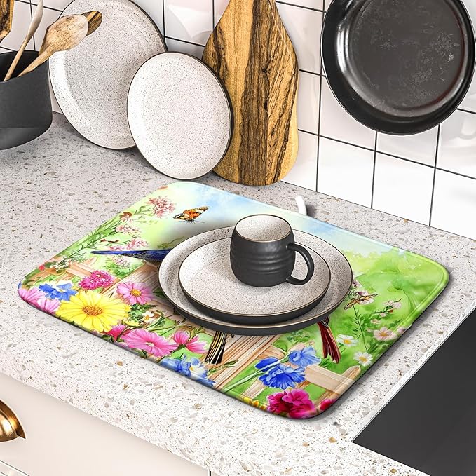 - 【ABSORBENT MATERIAL】-- This spring flower birds dish drying mat is made of absorbent microfiber and composite sponge material in the middle, which quickly absorbs water to keep the kitchen countertop dry and clean. Use alone or together with a dish drainer. Our no-slip base adds stability when drying glassware or other fragile items.