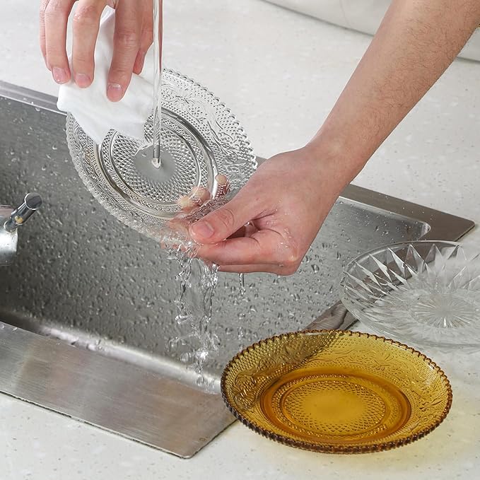 - Clear glass plates - This vintage dinnerware set is made from premium food-grade glass, transparent and pure, without impurities or bubbles, ensuring the sturdiness and durability of the plate. And these clear glass plates are easy to clean, the design is textured on the bottom but wiped clean easily with a sponge. The thick glass material also makes these glass dessert plates dishwasher safe, providing great convenience for your daily use and maintenance.