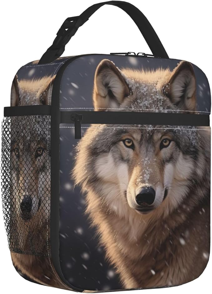 Reusable Snow Wolf Lunch Box for Kids, Insulated Majestic Winter Snowfall Animal Bag,Polyester Cooler Wildlife Lovers Handbags Case for School Picnic Work Travel Beach or Hiking, Gifts