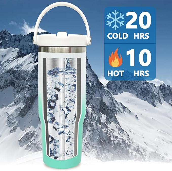 - KEEPS COLD FOR A LONG TIME: This 30 oz insulated tumbler with handle is constructed with double-wall vacuum insulation and premium 18/8 food grade stainless steel, BPA-free, keeping beverages cool for over 20 hours, and hot for up to 10 hours, no matter the climate or conditions.