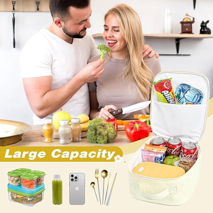 Aileam Lunch Box Lunch Bag for Women Cute Girls Lunch Box Insulated Womens Lunch Bag For Work Quilted Large Capacity Reusable Insulated Cooler for Work School Picnic Travel, Cream White