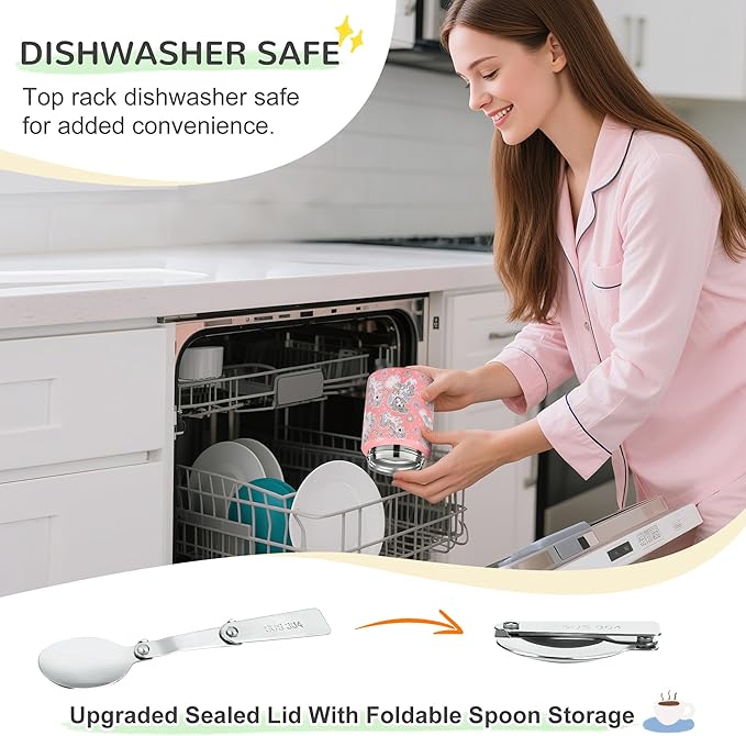 - EASY-FILL WIDE MOUTH & CLEVER ACCESSORIES - kids lunch box features a 2.75-inch opening for easy scooping, serving, and dishwasher top cleaning. Hidden grip handle on the lid for safe carrying. Stainless steel folding spoon for easy storage. Non-slip base to prevent slipping.
