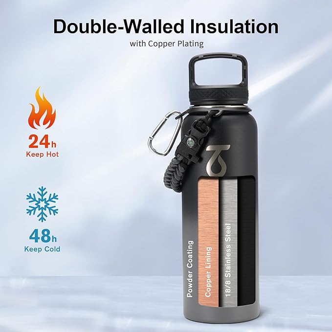 - Full-function Paracord Handle: 40 ounce water bottle come with paracord handle the brilliant paracord of matching colors bring out the bottle with a touch of youthful vibe. Compact compass and handy carabiner make the bottle the ideal survival kit for expeditions in the wild.
