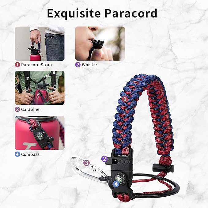 - Full-function Paracord Handle: 40 ounce water bottle come with paracord handle the brilliant paracord of matching colors bring out the bottle with a touch of youthful vibe. Compact compass and handy carabiner make the bottle the ideal survival kit for expeditions in the wild.