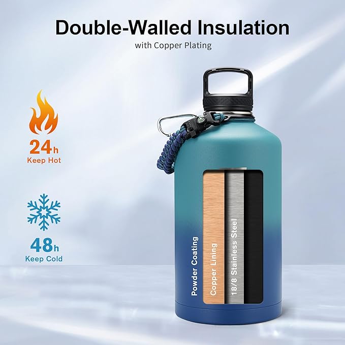 - Double Wall Insulation: Vacuum double wall stainless steel with copper plating maxes its keep-cold to 48 hrs and keep-hot to 24 hrs, allowing you to enjoy your favorite flavor in the long run.128oz large capacity water bottle perfect for outdoor camping, hiking.