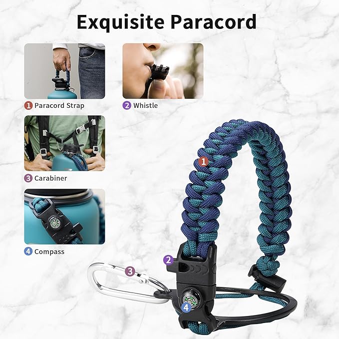 - Full-function Paracord Handle: Brilliant paracord of matching colors bring out the bottle with a touch of youthful vibe. Compact compass and handy carabiner make the bottle the ideal survival kit for expeditions in the wild.