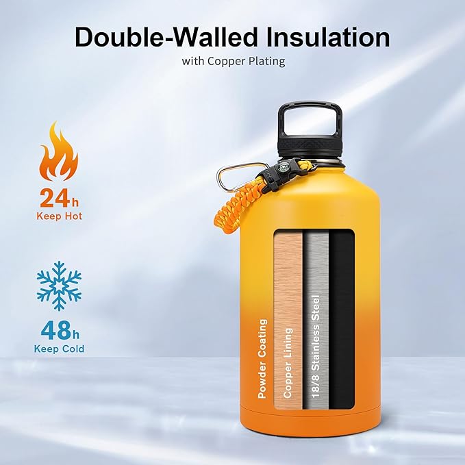 - Double Wall Insulation: Vacuum double wall stainless steel with copper plating maxes its keep-cold to 48 hrs and keep-hot to 24 hrs, allowing you to enjoy your favorite flavor in the long run.128oz large capacity water bottle perfect for outdoor camping, hiking.