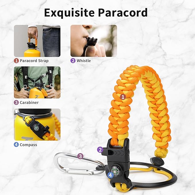 - Full-function Paracord Handle: Brilliant paracord of matching colors bring out the bottle with a touch of youthful vibe. Compact compass and handy carabiner make the bottle the ideal survival kit for expeditions in the wild.