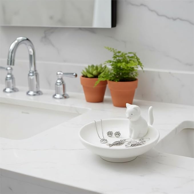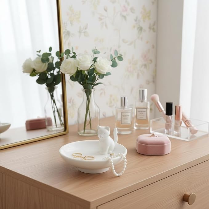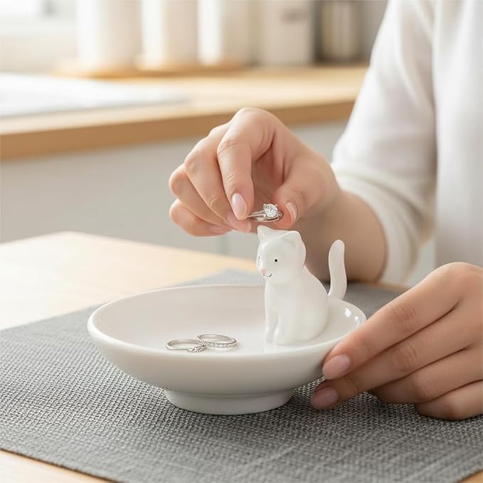 - 【Decorative Jewelry Plate】The ceramic trinket dish is decorated with a Lovely white cat. With this stylish piece, it brings love and an elegant artistic vibe into your home.