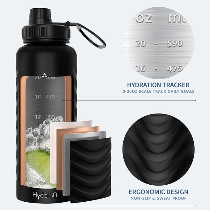 - HYDRATION MEASUREMENT & FREE CLEANING KIT:This mens water bottle internal 0-20oz markings track daily hydration goals. Includes 2 lids, a straw, cleaning brush, and silicone boot for fresh sips anywhere.