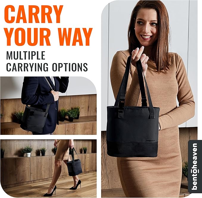 Bentoheaven Insulated Lunch Tote for Work - Durable Materials, Variable Strap/Handle, Wide Opening - Cooler Lunch Bag for Women & Men - Fits all major Bento Lunch Boxes and Other Containers (Black)