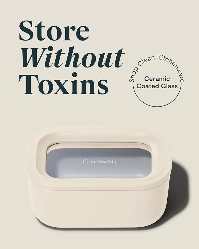 Caraway Mini Rectangle Food Storage Container - 2.6 Cup Glass Storage Container for Food - Non-Toxic Ceramic-Coated Glass - Air Release Technology - Compact & Stackable Design - Cream