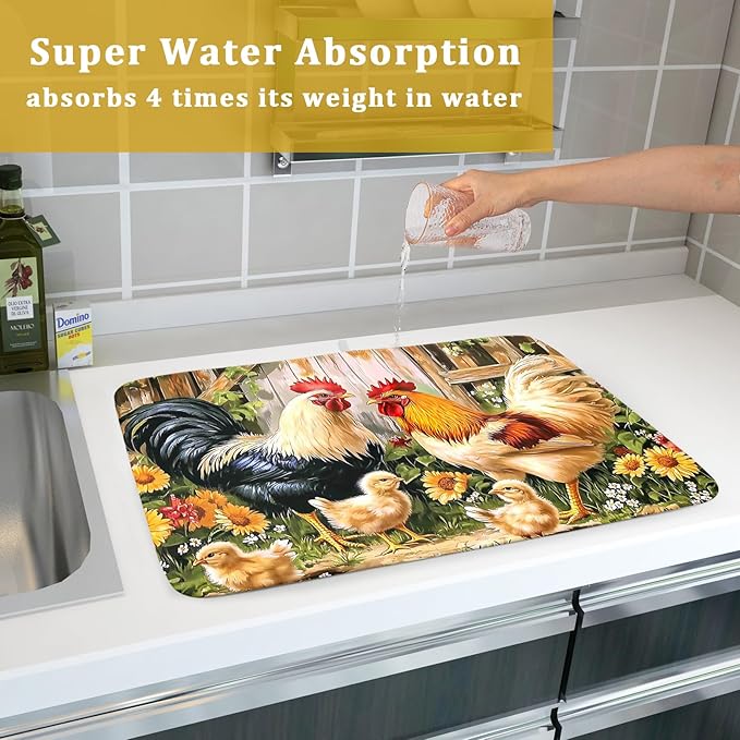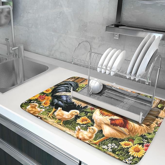 - 【ABSORBENT MATERIAL】-- This chickens dish drying mat is made of absorbent microfiber and composite sponge material in the middle, which quickly absorbs water to keep the kitchen countertop dry and clean. Use alone or together with a dish drainer. Our no-slip base adds stability when drying glassware or other fragile items.