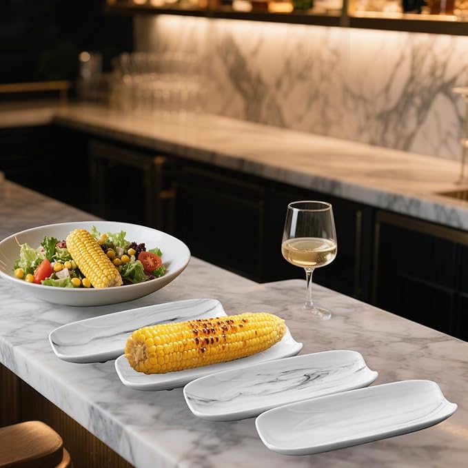 Cinf Ceramic Corn Cob Holders 8.8" Corn Dishes Set of 4 Trays Non-slip Bottom Microwave Dishwasher Oven Safe (Marble Pattern)