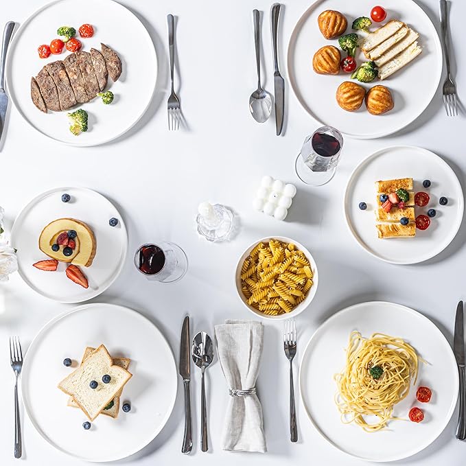 - ULTIMATE DURABILITY:Crafted from high-quality clay and fired at 2336°F, these plates and bowls are made of high-temperature porcelain, resulting in a denser internal structure that enhances durability while keeping them lightweight. Say goodbye to chips, cracks, and scratches caused by cutlery, as their superior heat resistance ensures long-lasting use for all your dining needs.