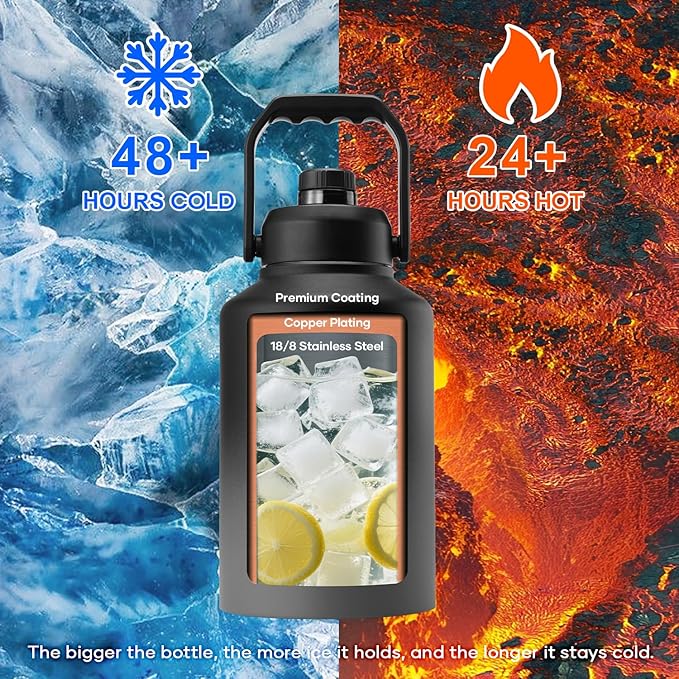 - ICE-COLD FOR DAYS: With our ThermoArmour technology and triple-layer vacuum insulation, our gallon water bottles lock in chill for 48+ hours and keep drinks hot for 24+ hours. Pro tip: the bigger the bottle, the more ice it holds, and the longer it stays cold