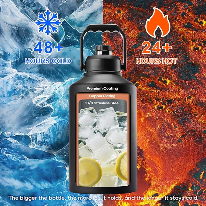 - Ice Cold for Days: With our ThermoArmour technology and triple-layer vacuum insulation, our gallon water bottles lock in chill for 48+ hours and keep drinks hot for 24+ hours. Pro tip: the bigger the bottle, the more ice it holds, and the longer it stays cold