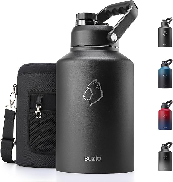 BUZIO 1 Gallon Water Bottle Insulated, (Cold for 48 Hrs) 3.58in Big Wide Mouth Leak Proof, 128oz Large Water Jug Stainless Steel Metal Flask with Handle for Camping,Outdoor Work,Travel,Hiking, Black