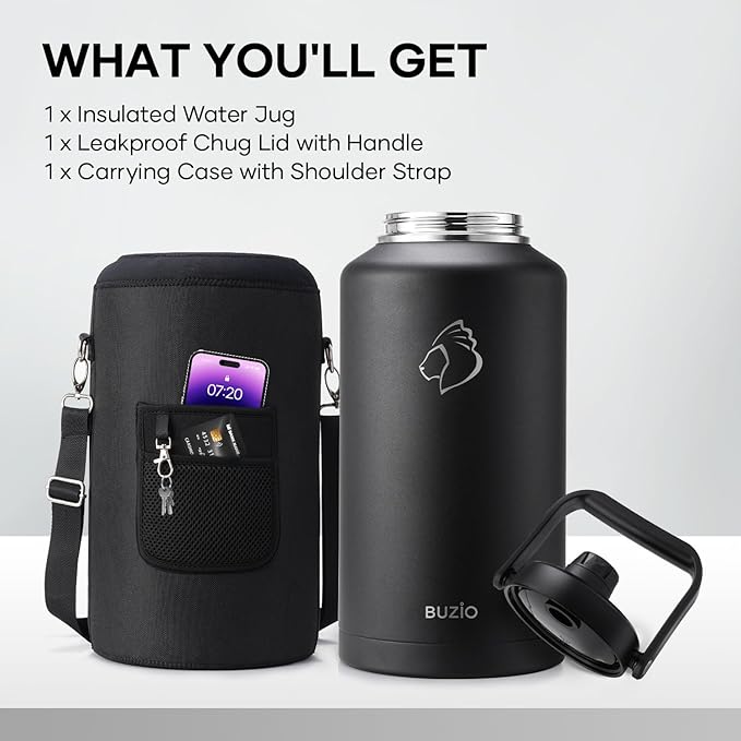 - What You Get: 1 x gallon water bottle, 1 x chug lid with handle, and 1 x carrying case with shoulder strap. Bonus: The enhanced carrying case includes two convenient pockets—perfect for your phone, cards, keys, and other essentials