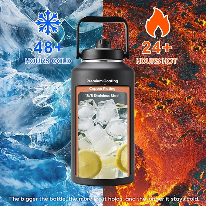 - Ice-Cold For Days: With our ThermoArmour technology and triple-layer vacuum insulation, our gallon water bottles lock in chill for 48+ hours and keep drinks hot for 24+ hours. Pro tip: the bigger the bottle, the more ice it holds, and the longer it stays cold