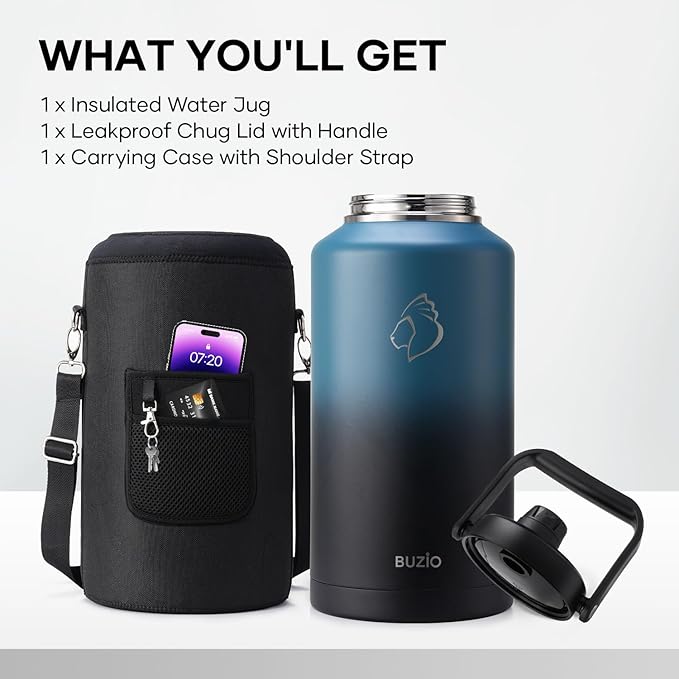 - What You Get: 1 x gallon water bottle, 1 x chug lid with handle, and 1 x carrying case with shoulder strap. Bonus: The enhanced carrying case includes two convenient pockets—perfect for your phone, cards, keys, and other essentials