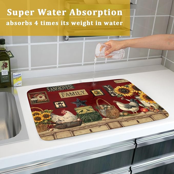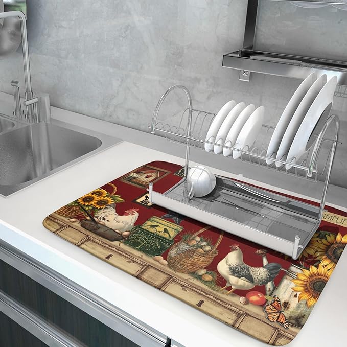 Rooster Dish Drying Mat 18x24 Inch with Hanging Loop,Vintage Country Style Farmhouse Chickens Absorbent Microfiber Non-Slip Counter Rack Sink Drainer Pad for Kitchen Countertop Table Decor