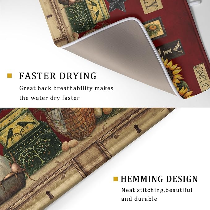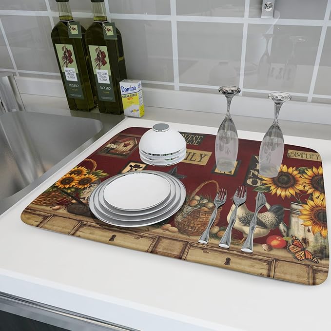- 【WILD USAGE】-- This rustic rooster dish rack mat captures drips from under the dish rack.you can also place pots, pans, dishes, cups and bottles directly on the mat. As a kitchen counter mat, it Protects countertops and tables from hot pots and pans while protecting other appliances.