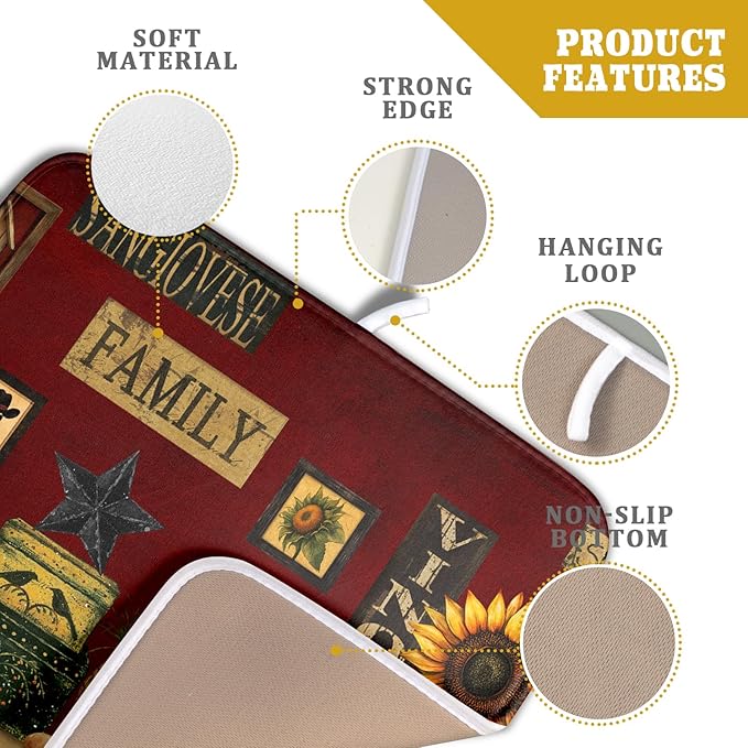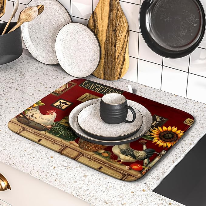 Vintage Rooster Dish Drying Mats 16x18 Inch,Farmhouse Country Hen Chicken Sunflower Microfiber Absorbent Quick-Dry Drainer Rack Sink Protector Pad for Kitchen Counter Decor
