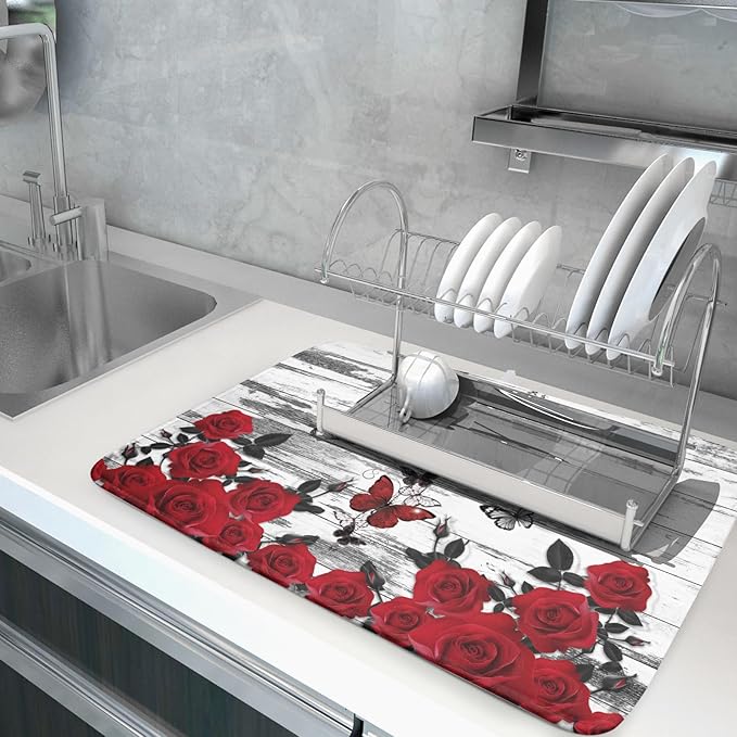 Red Rose Dish Drying Mat 18x24 inch Romantic Floral Absorbent Microfiber Sink Counter Dishware Drainer Pad for Kitchen Coffee Bar Decor