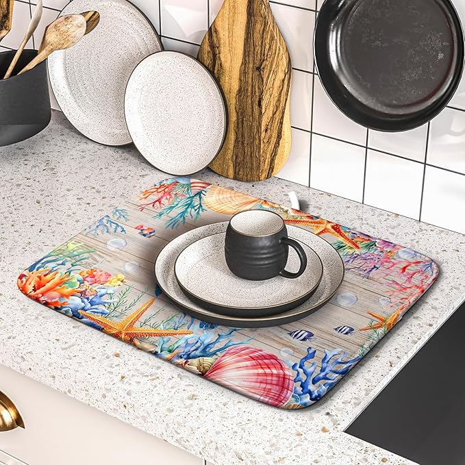 - 【Wide Usage】The dish drying mat designed with starfish shell pattern, it is beautiful, soft, and durable. Not only a dish drying mat, cup mat, heat resistant mat, you can also use it as a kitchen countertop insulation mat. It is also a good choice to use it as a pet mat, picnic mat.