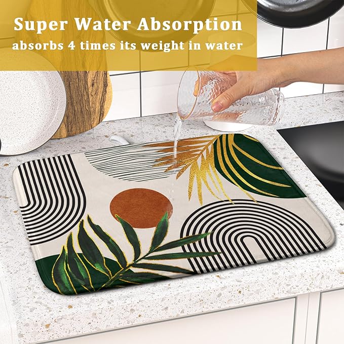 Boho Leaves Dish Drying Mat 16x18 inch Mid Century Absorbent Drainer Rack Mats Fast Dry Bottles Dish Dry Pad Protector Kitchen Accessories