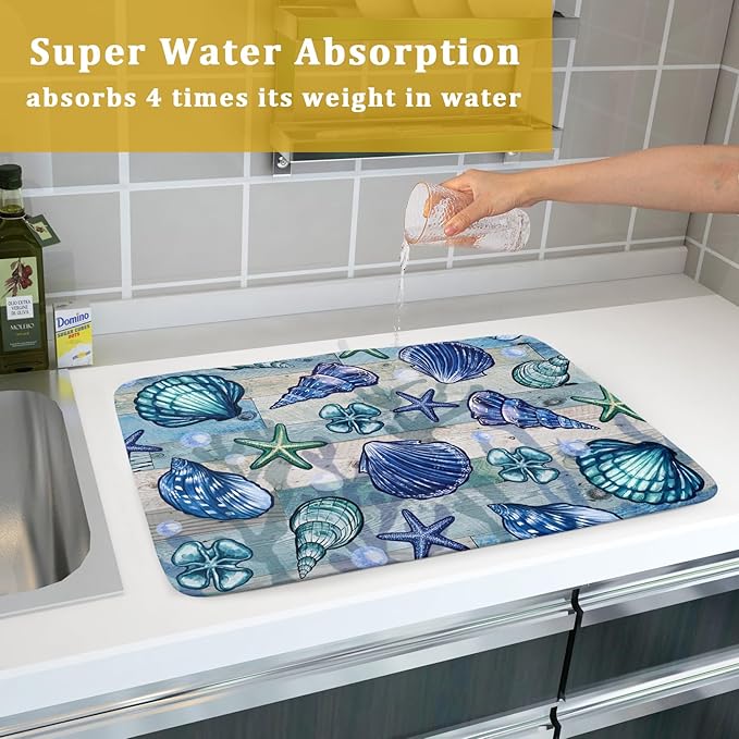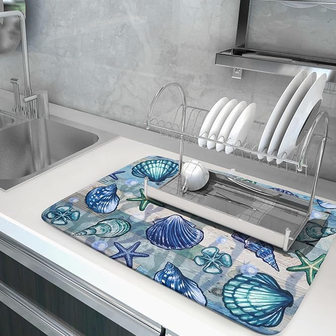 Starfish Seashell Dish Drying Mat 18x24 inch Coastal Beach Dish Drainer Rack Pad Absorbent Microfiber Fast Dry Kitchen Counter Accessories