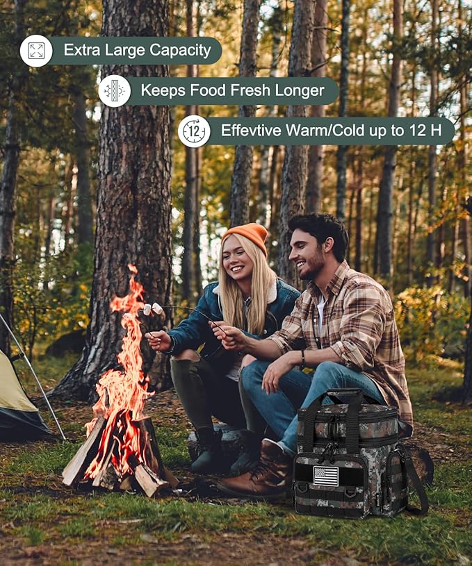 Tactical Lunch Box for Men, Expandable Large Insulated Lunch Bag for Adult, Heavy Duty Double Deck Lunch Cooler Bag with Shoulder Strap, Leakproof Soft Lunch Pail with American Flag - Green Camo