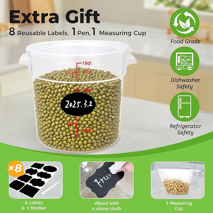 - Large Capacity: Includes 4×18QT food storage containers with lids, 8 reusable labels, a marker, and a measuring cup. Labels are wipeable for easy reuse. Ideal for bulk storage and better measurement