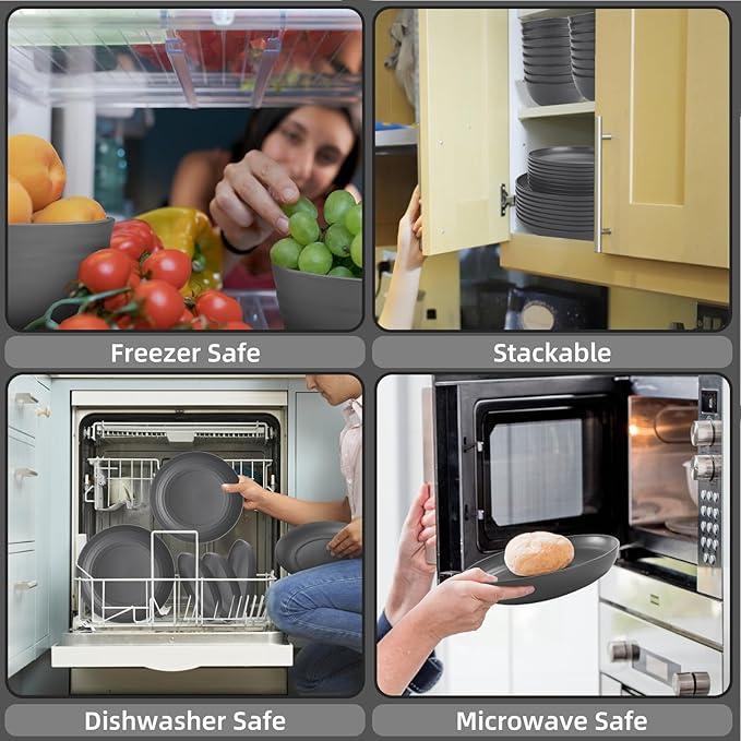 - 【Dishwasher safe and Lightweight】And kitchen plates and bowls set are very easy to clean, we can wash them with soap and hot water or place them into our dishwasher. And gray dish set for 4 work great in and microwaves without getting too hot.Fridge and freezer safe too!Please note that there is a smell of wheat when you use it for the first time, it is recommended to wash it before use.