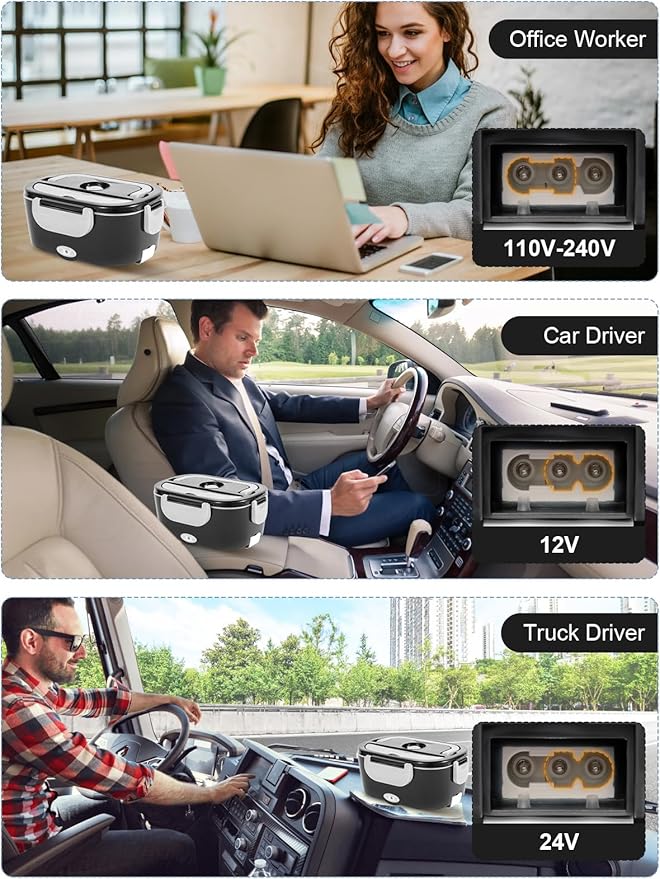 - 3-in-1 Electric Lunch Box for Home, Office, and Travel - This versatile heated lunch box for men supports 110V-230V for home or office use, and 12V/24V for use in cars and trucks, making it perfect for truck drivers, office workers, and travelers. Enjoy hot meals anywhere with this all-in-one solution