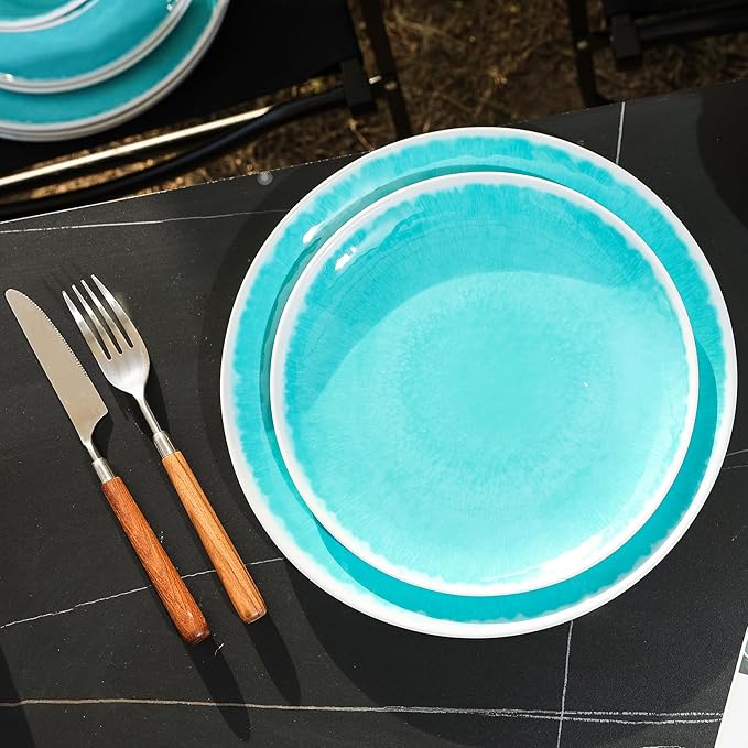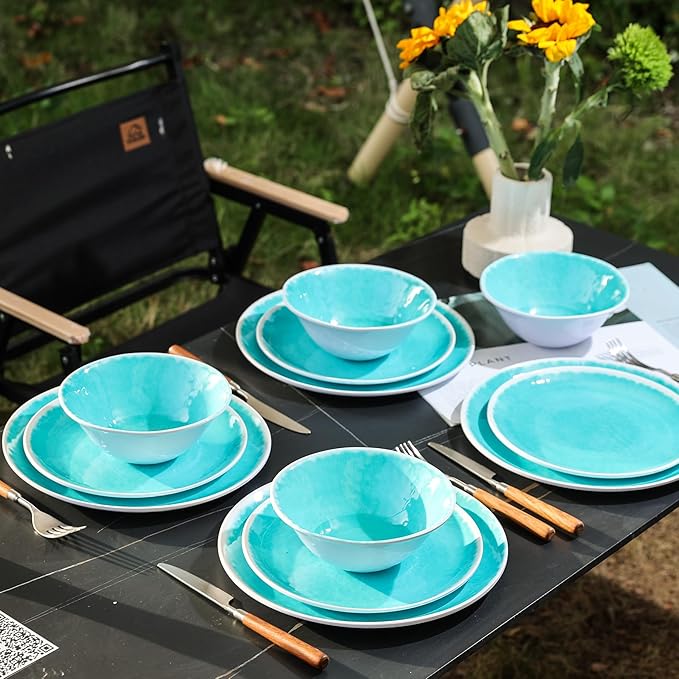 Melamine Dinnerware Sets 12 Pcs, Melamine Plates and Bowls,Party Plates and Bowls Sets, Camping Dishes Set for 4, Unbreakable, BPA Free, Dishwasher Safe (Lake Green)
