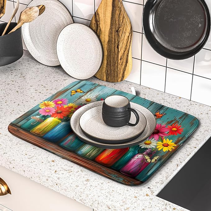 Botanical Flowers Dish Drying Mats 16x18 Inch,Colorful Daisy Mason Jar on Wood Plank Microfiber Quick-Dry Drainer Rack Absorbent Pad for Farmhouse Kitchen Countertop Sink Decor