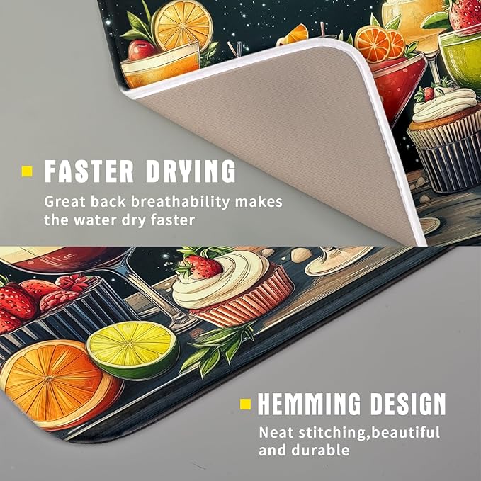 - Size: The highly absorbent drying mat measure 16 x 18 in(40.6 x 45.7 cm) for you. Fit most countertop space. Different design on 2 sides, one side can suck moisture with fruits pattern, another one gray non-slip side