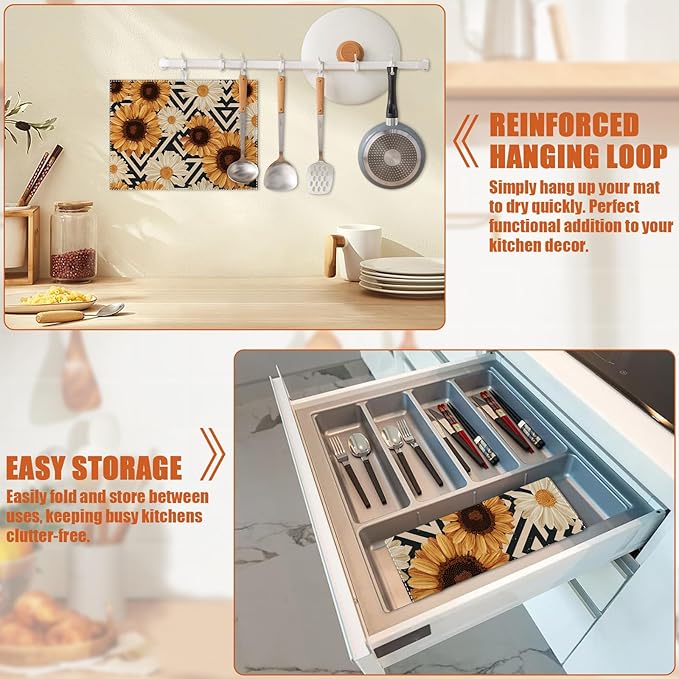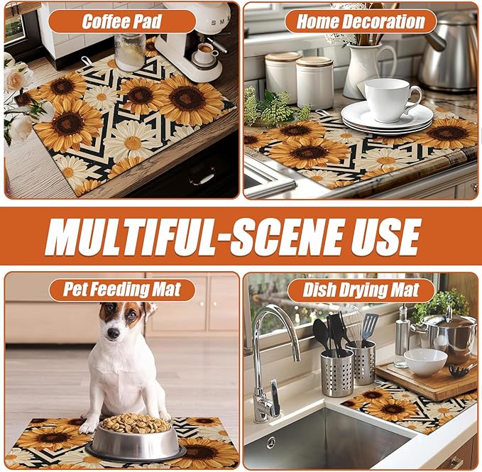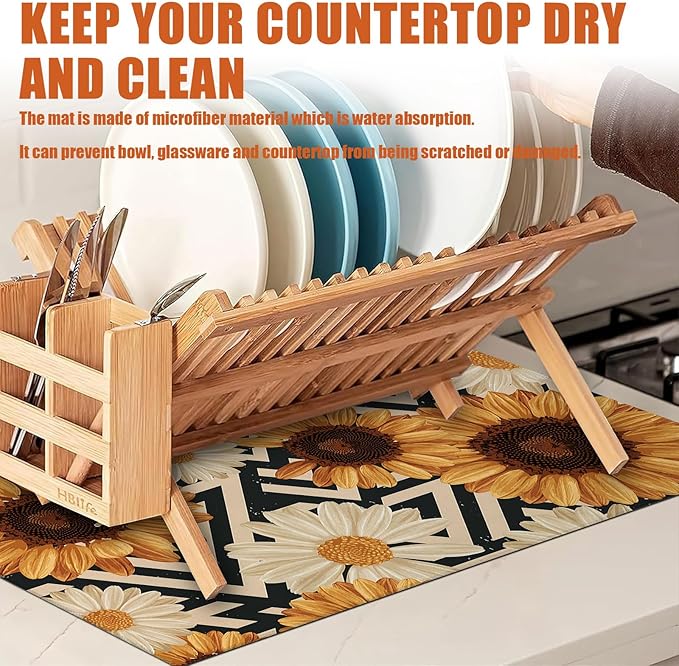 Vintage Sunflower Daisy Dish Drying Mat for Kitchen Counter Microfiber Absorbent Dish Kitchen Drying Mat Draining Reusable Washable for Dishes/Utensils/Counterto