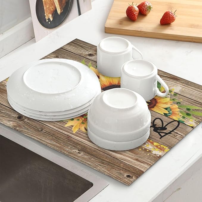 Sunflower On Board Rustic Yellow Summer Fall Live Laugh Love Drying Mat 16x18 Inch For Kitchen Counter Drying Mats Dish For Kitchen Counter Easy Clean Kitchen