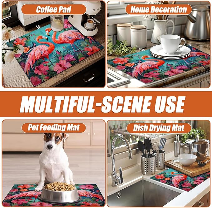Tropical Flower Flamingo Dish Drying Mat for Kitchen Counter Microfiber Absorbent Dish Kitchen Drying Mat Draining Reusable Washable for Dishes/Utensils/Counterto