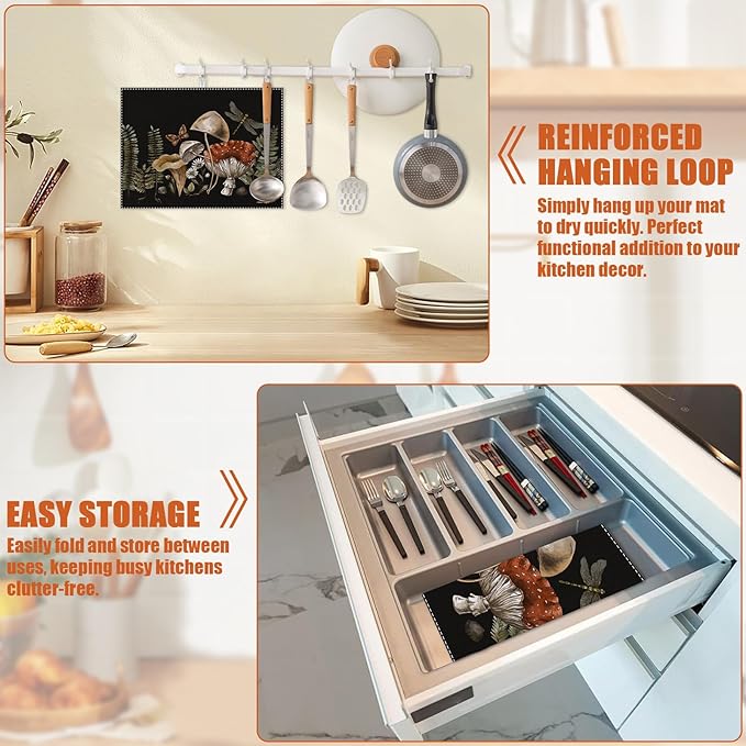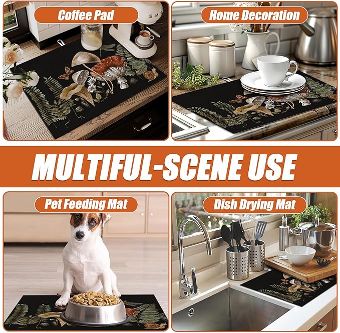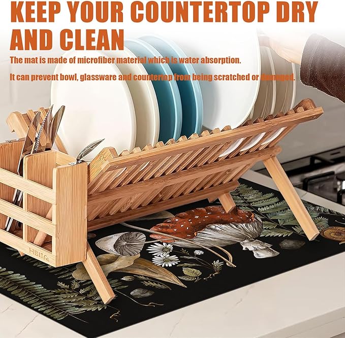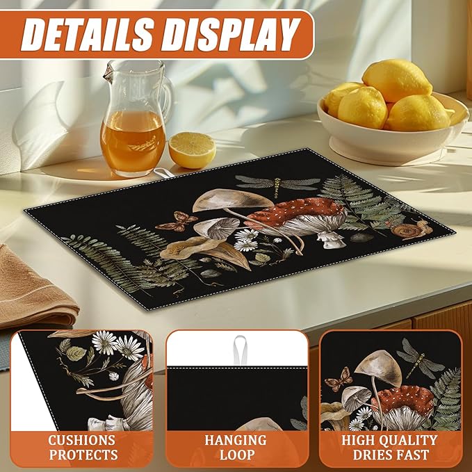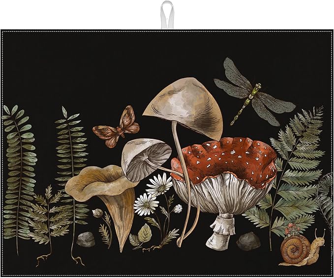 Vintage Mushroom Dish Drying Mat for Kitchen Counter Microfiber Absorbent Dish Kitchen Drying Mat Draining Reusable Washable for Dishes/Utensils/Counterto