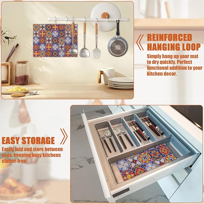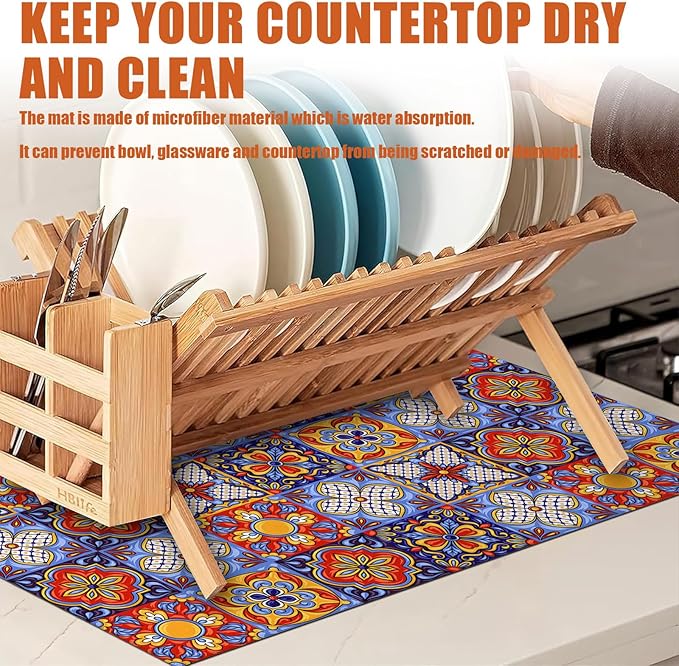 Talavera Mexican Tiles Dish Drying Mat for Kitchen Counter Microfiber Absorbent Dish Kitchen Drying Mat Draining Reusable Washable for Dishes/Utensils/Counterto