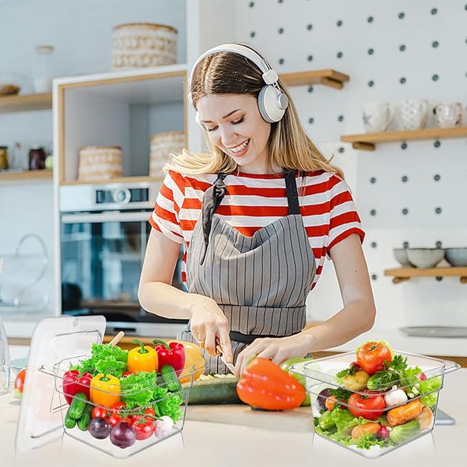 - Practical Tools: These 1/6 size food pans and food covers are easy to clean and store, support quick freezing and refrigeration, and can be placed in cabinets, refrigerators, dining tables, and kitchens without taking up too much storage space, the clear handled pan lids can be reusable and stack, effectively cover and keep foods from dirt, hand wash with water for quick cleanup, not dishwasher safe