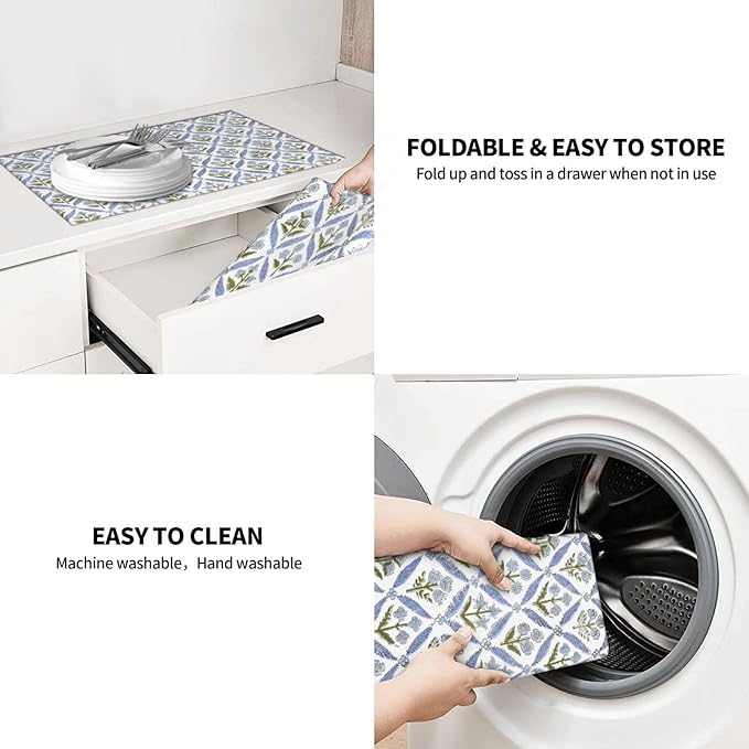- 【Special Design】:The block print dish drying mat has blue flower pattern,great kitchen counter decoration,elegant and atmospheric